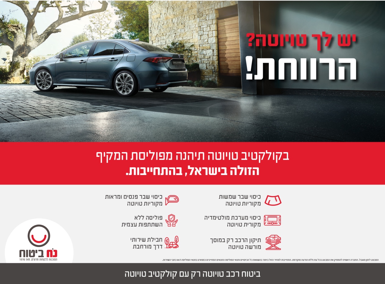 אנו מזמינים אותך להינות מתוכנית ביטוח יחודית לרכבי TOYOTA, המבטיחה את איכות התיקון, ומסייעת בהגנה מרבית על בטיחות הרכב ושמירת הערך לאורך השנים.